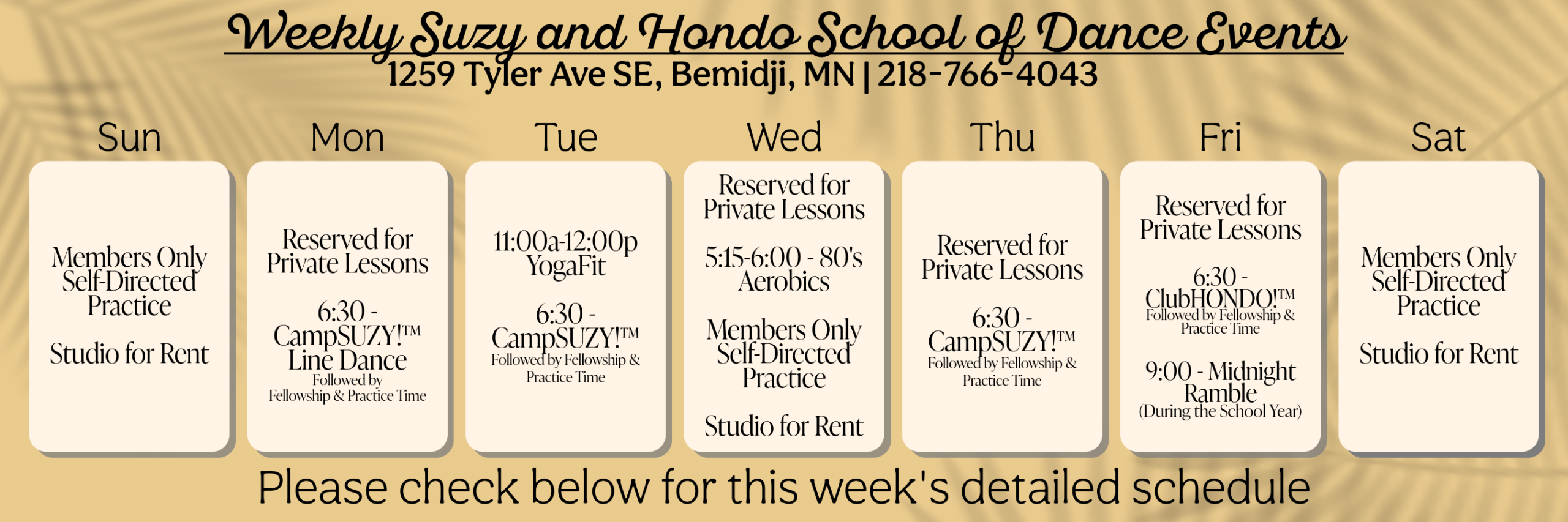 Suzy and Hondo School of Dance is a Social Dance and Ballroom Dance school in Bemidji, MN. Located in northern Minnesota, we serve the greater Bemidji area with lessons in Ballroom, Social, Latin, Swing, Folk, Fad, Fitness, Party and Line Dances. Our mission is to serve small town dancers, and dance teachers. Whether a dance class, private lessons, or online lessons we provide a fun and enthusiastic environment and welcome dancers of all ages and abilities.